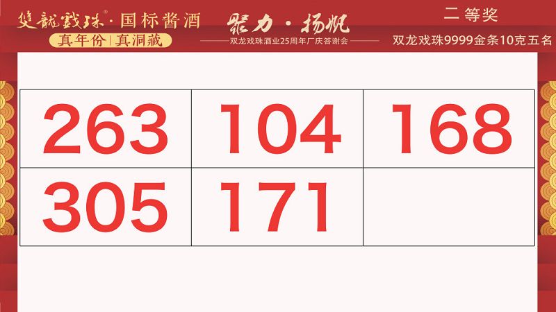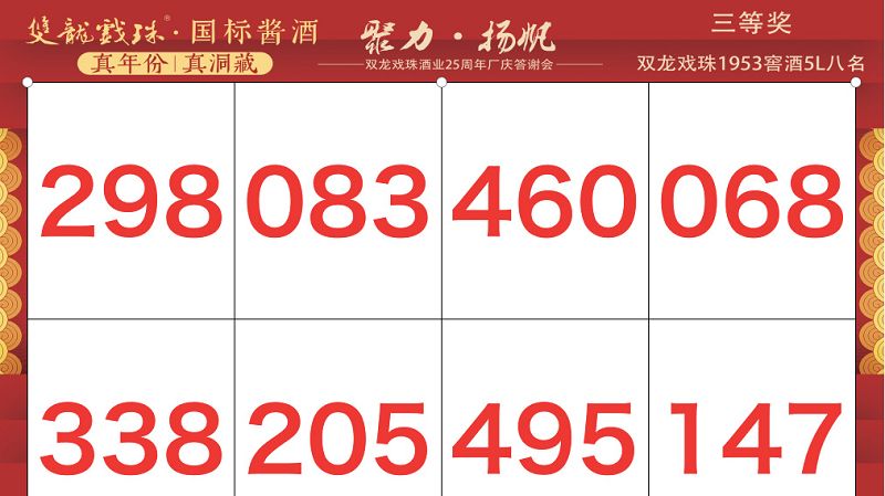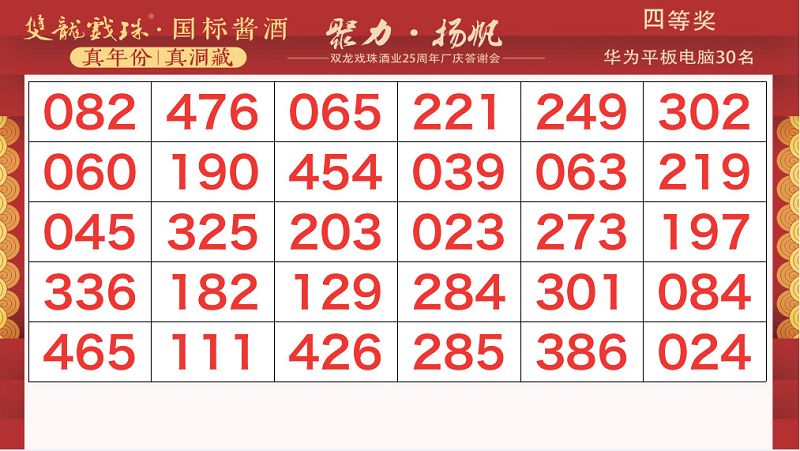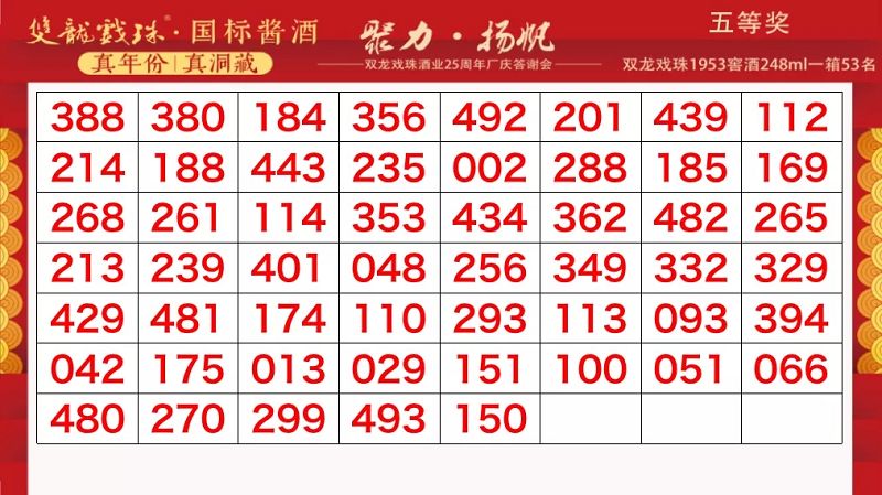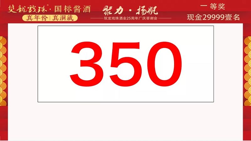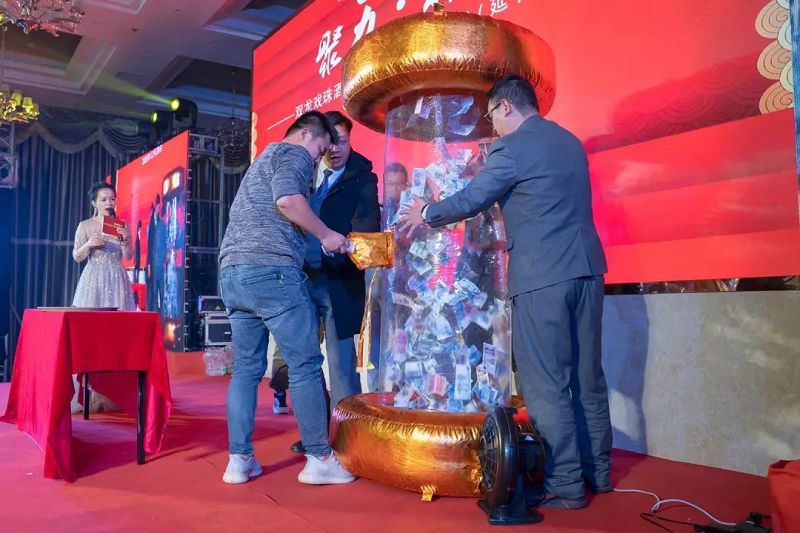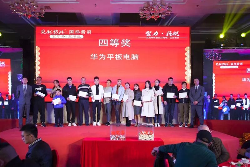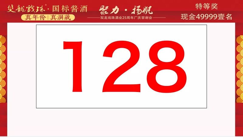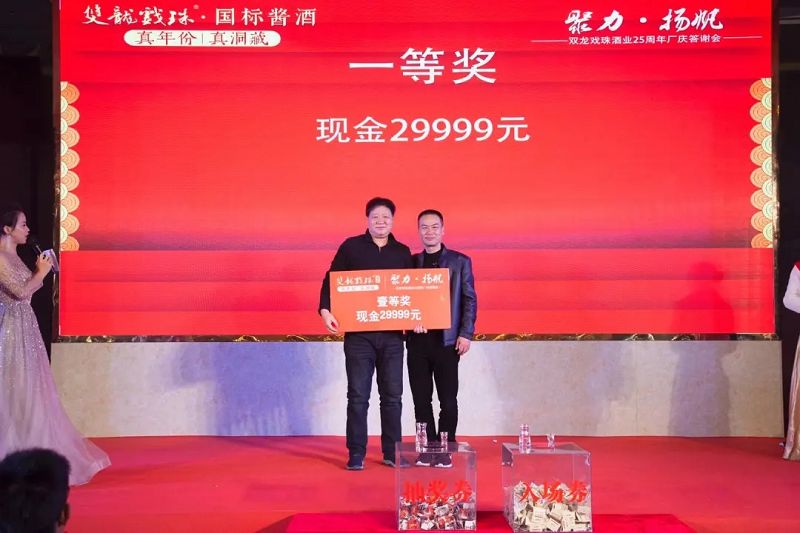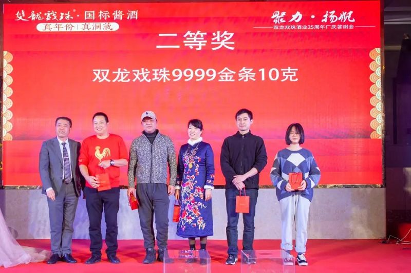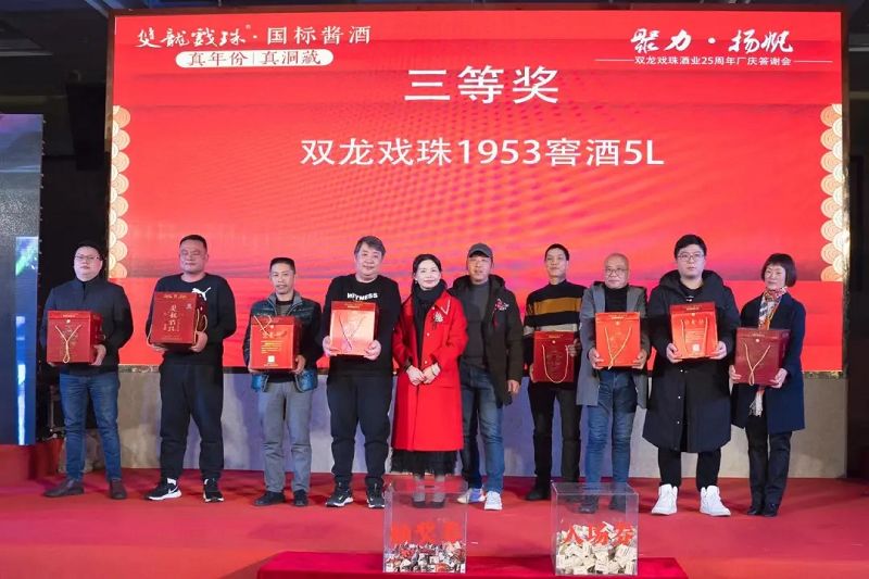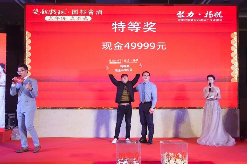 本場(chǎng)答謝宴共誕生特等獎(49999元現金)得主1位、一等獎(29999元現金)得主1位、二等獎(雙龍戲珠9999金條10克)得主5位、三等獎(5L雙龍戲珠1953洞藏窖酒)得主8位、四等獎(華為平板電腦壹臺)得主30位、五等獎(雙龍戲珠1953窖酒248ml壹箱)得主53名。