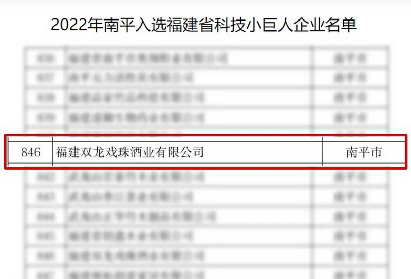 近日,福建省科學(xué)技術(shù)廳公布了2022年“福建省科技小巨人企業(yè)”名單,福建雙龍戲珠酒業(yè)有限公司憑借雄厚的技術(shù)實(shí)力和卓越的產(chǎn)品品質(zhì),從眾多企業(yè)中脫穎而出,獲評“福建省科技小巨人企業(yè)”。