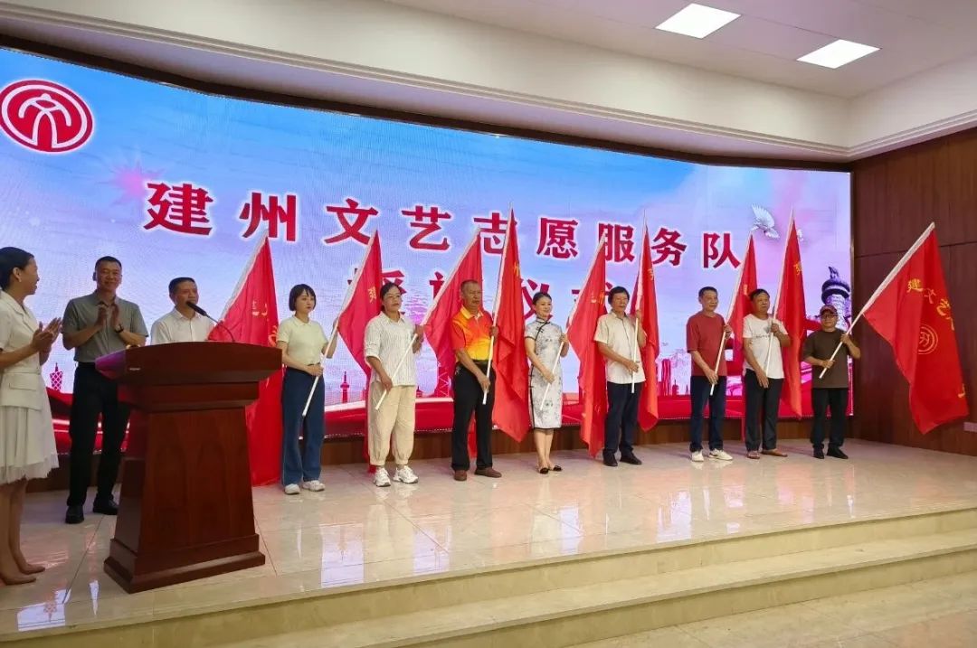 由市委常委、宣傳部部長(cháng)葉華,市委宣傳部副部長(cháng)、文聯(lián)主席陳麗芝為建州文藝志愿服務(wù)隊授旗,書(shū)法協(xié)會(huì )、舞蹈協(xié)會(huì )、音樂(lè )協(xié)會(huì )、作家協(xié)會(huì )、攝影家協(xié)會(huì )、美術(shù)家協(xié)會(huì )、建州技藝團、老來(lái)樂(lè )傳藝隊、奇石協(xié)會(huì )會(huì )長(cháng)上臺接授隊旗。
