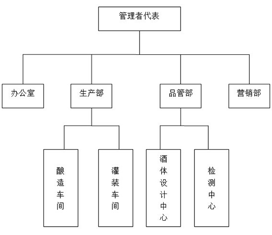 本公司確立以管理者代表負責的質(zhì)量管理組織,由品管部全面負責公司的產(chǎn)品質(zhì)量。下設辦公室、生產(chǎn)部(負責釀造車(chē)間和灌裝車(chē)間)、品管部(負責檢測中心和酒體設計中心)、營(yíng)銷(xiāo)部。