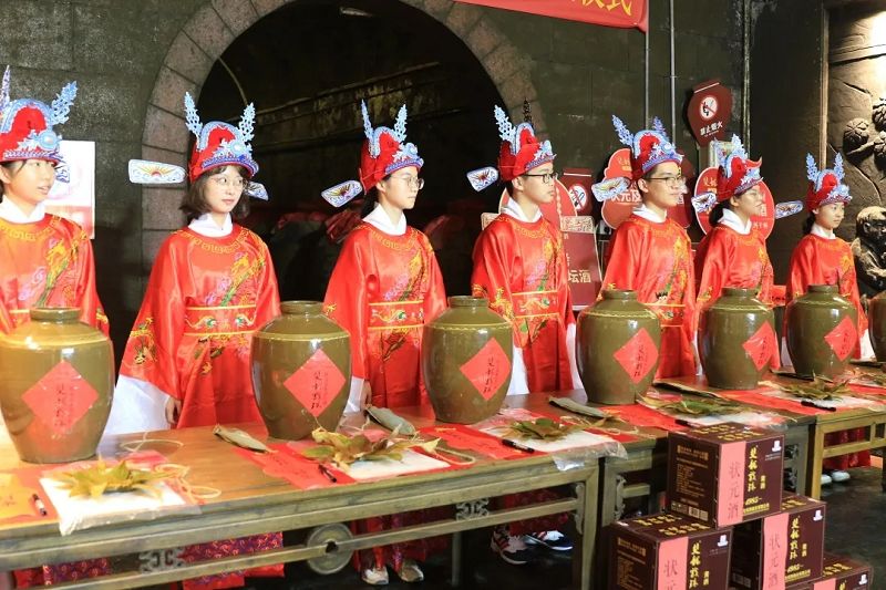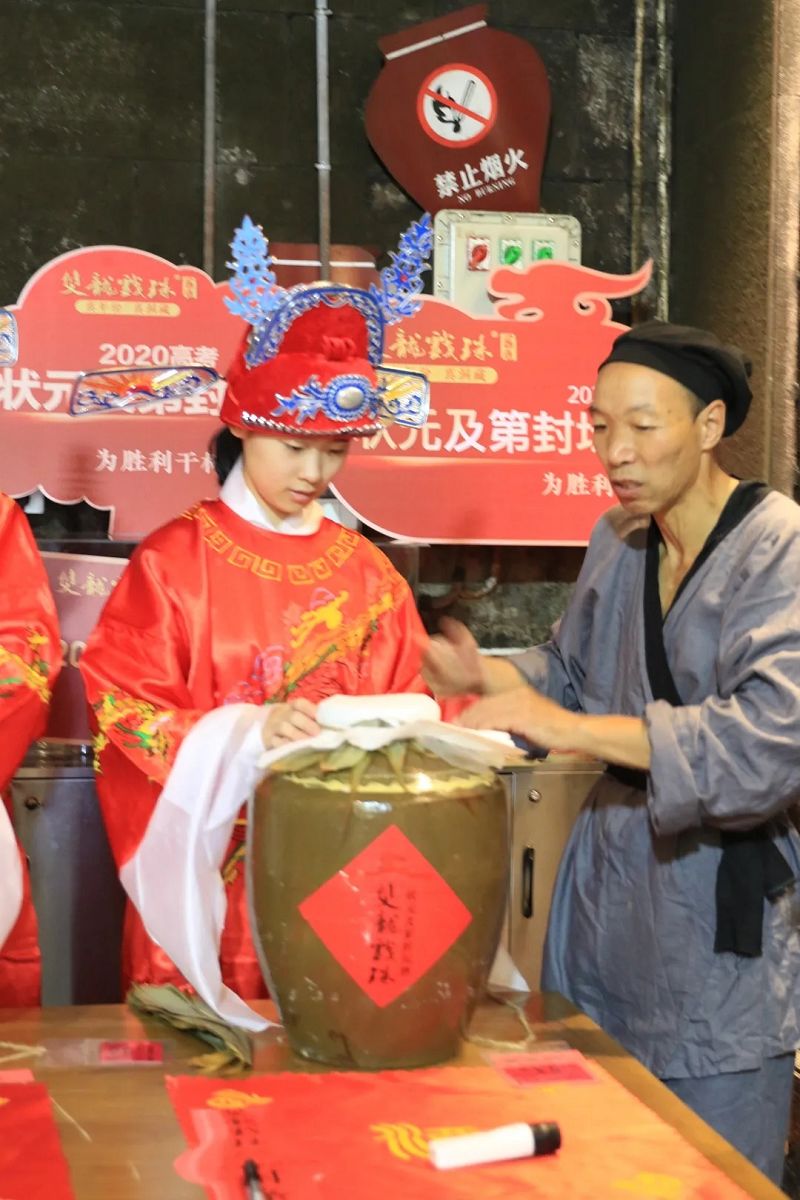 狀元們沿紅毯走向封壇地點(diǎn)—金龍洞,福建雙龍戲珠酒業(yè)有限公司董事長(cháng)黃德鋒出席并致辭,釀酒師傅與狀元們一起覆粽葉、捆紅繩、蓋紅布、貼封條,祈平安。